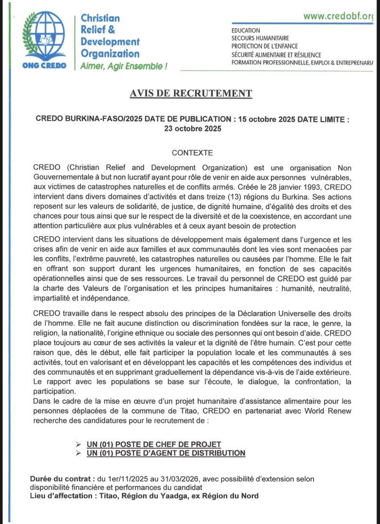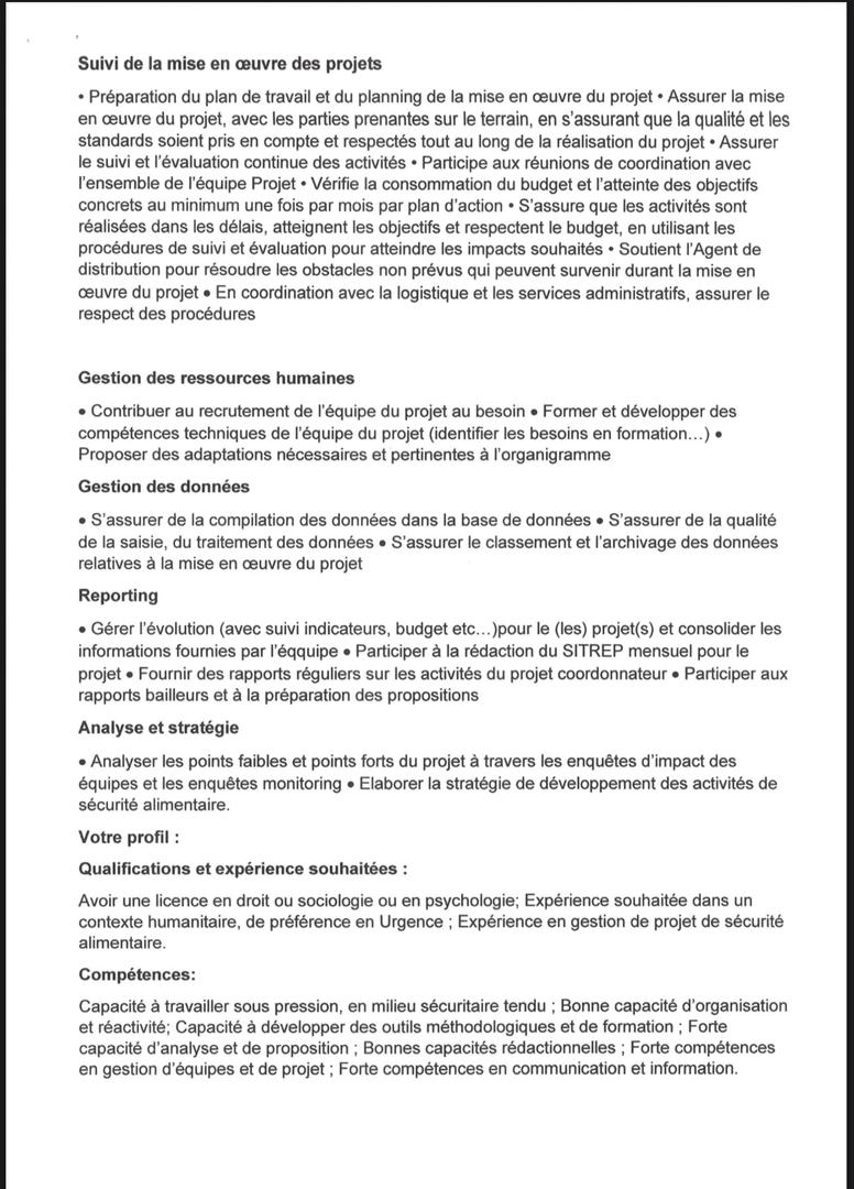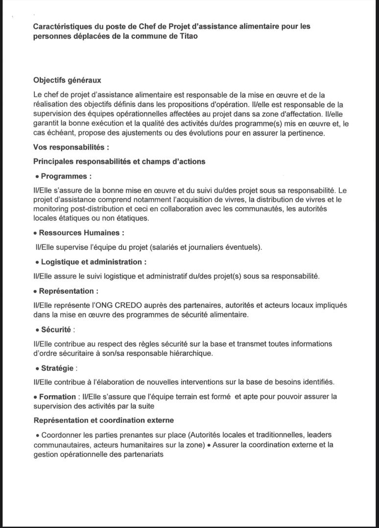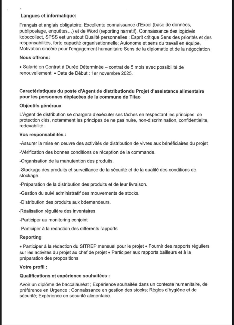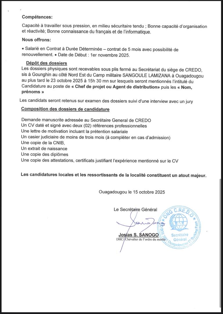 [AVIS DE RECRUTEMENT POUR UN(1) POSTE DE CHEF DE PROJET ET UN(1) POSTE D’AGENT DE DISTRIBUTION]